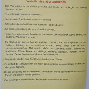 Illustriertes Wörterbuch herausgegeben von dem ägyptischen Verlag für Kinderbücher Safir. Dieses Paket enthält das illustrierte Wörterbuch im DIN A4 Format mit ca. 120 Seiten in denen die arabischen Worte mit deren Illustration und deren Übersetzung abgebildet sind.